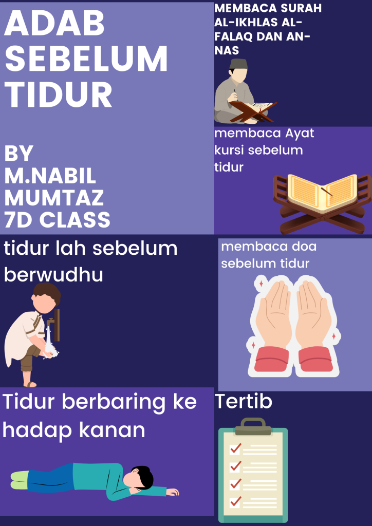 This is a poster on etiquette before going to sleep, namely procedures before going to sleep according to the Sunnah of the Prophet, such as always shaking out the mattress before going to bed, ablution before going to bed and when sleeping you must face the right side.