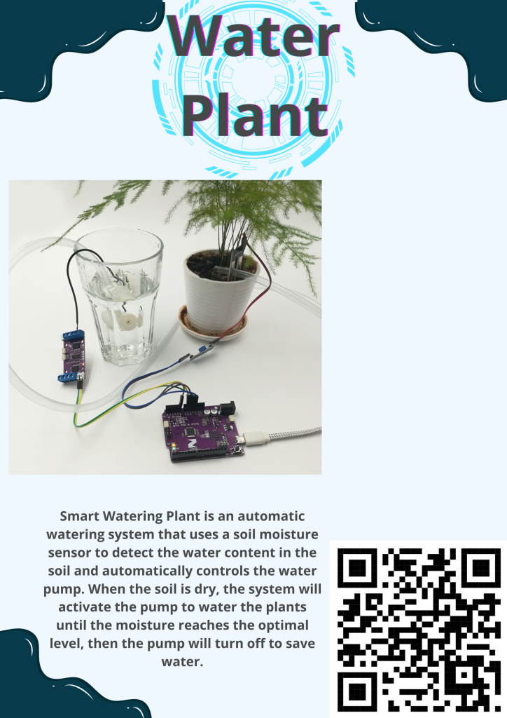 Smart Watering Plant is an automatic watering system that uses a soil moisture sensor to detect the water content in the soil and automatically controls the water pump. When the soil is dry, the system will activate the pump to water the plants until the moisture reaches the optimal level, then the pump will turn off to save water.