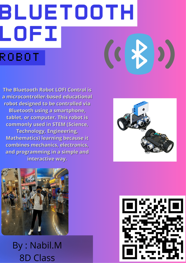 The Bluetooth Robot LOFI Control is a microcontroller-based educational robot designed to be controlled via Bluetooth using a smartphone, tablet, or computer. This robot is commonly used in STEM (Science, Technology, Engineering, Mathematics) learning because it combines mechanics, electronics, and programming in a simple and interactive way.