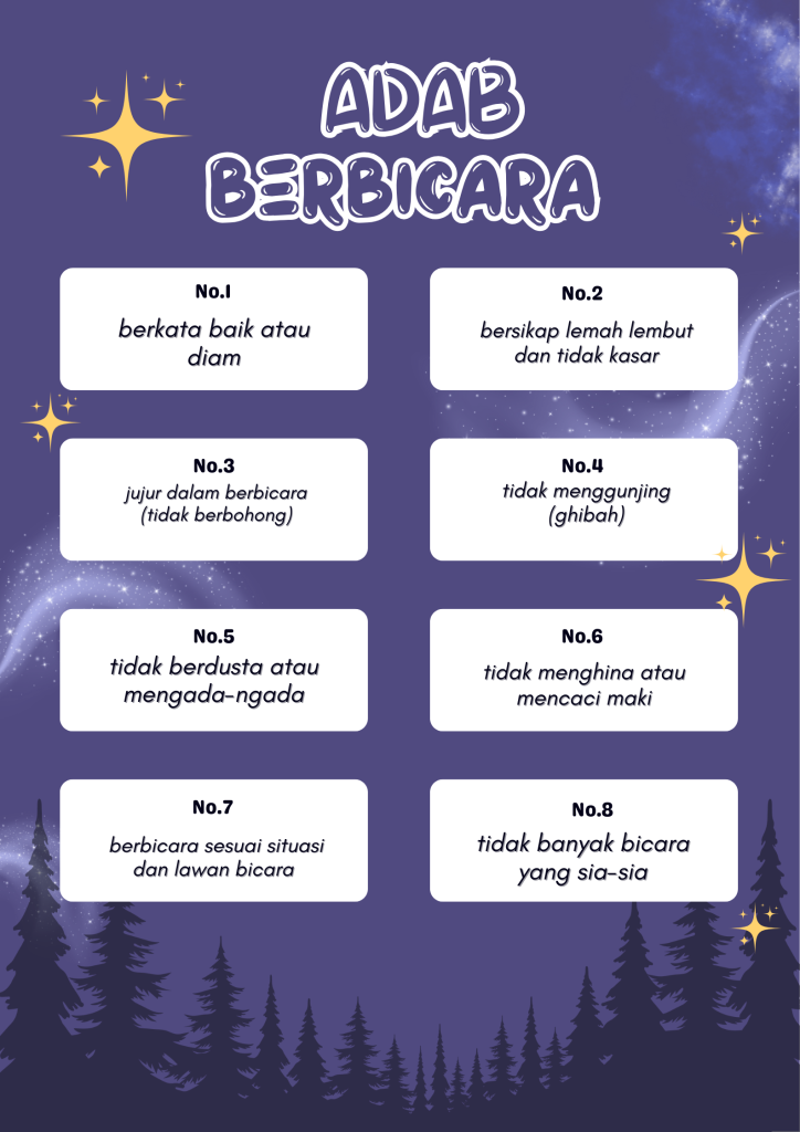 By admin / September 3, 2025 (Diniyah Lesson) Canva Poster Adab Adab Berbicara The “Speaking Manners” poster features engaging visuals, calming colors, and a well-organized layout. Its message is highly relevant for moral education, both in schools, religious study groups, and in everyday life. Download Project
